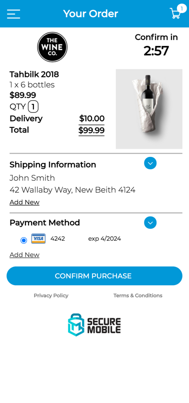If you are a registered member of the SECUREMobile™ Network, you will be able to complete any purchase from a SECUREMobile™ Authorised Vendor, a SECUREMobile™ Promotion or from the SECUREMobile™ Marketplace in under 30 seconds.
